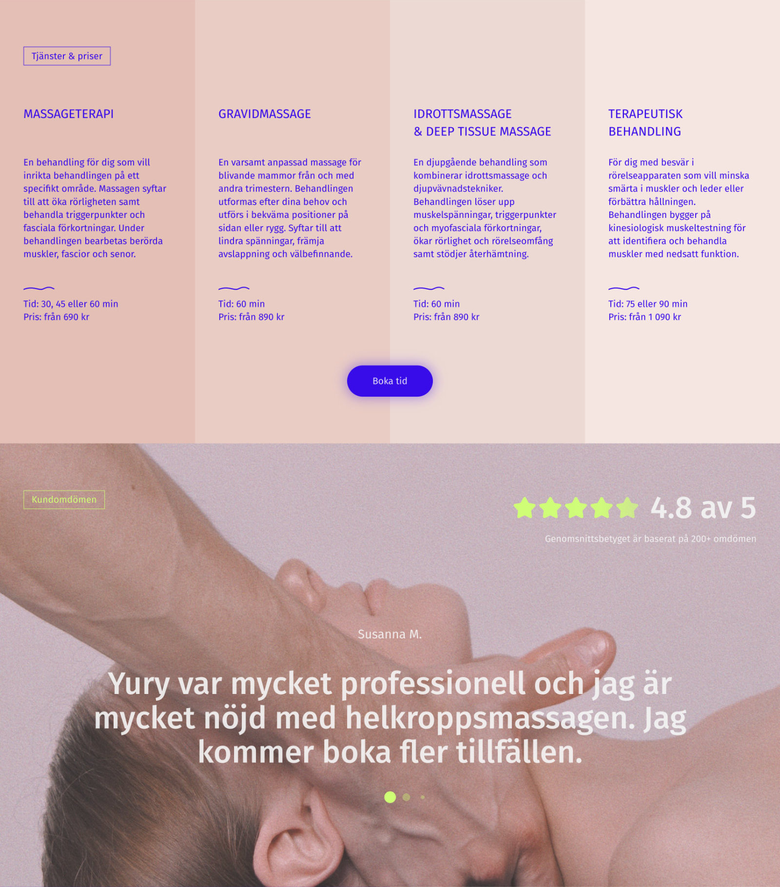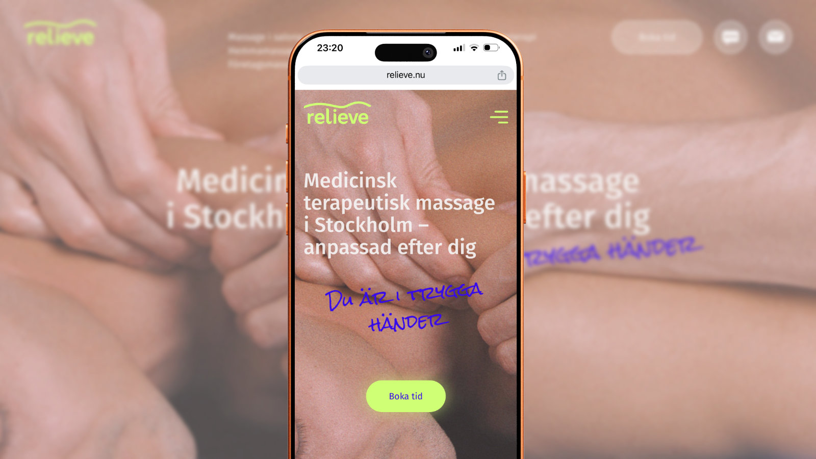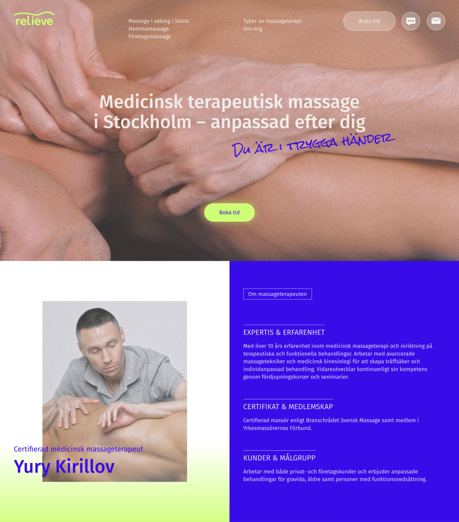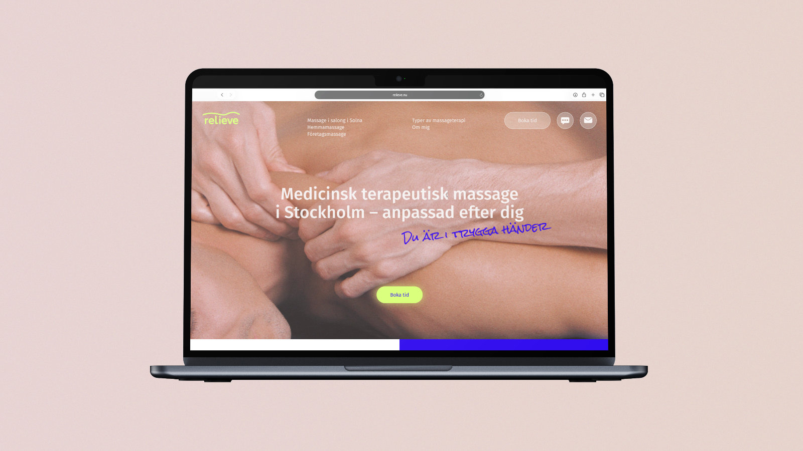 Vi utvecklade en ny visuell identitet och en ny webbplats för en terapeutisk massör: tog fram en logotyp, uppdaterade färgpaletten, bearbetade texter och visuellt material samt förenklade vägen till bokning och anpassade webbplatsen för smidig användning på smartphone.